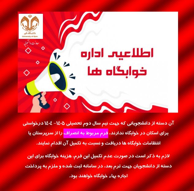 آن دسته از دانشجویانی که جهت نیم سال دوم تحصیلی 1405- 1404 درخواستی برای اسکان در خوابگاه ندارند، فرم مربوط به انصراف را از سرپرستان یا انتظامات خوابگاه ها دریافت و نسبت به تکمیل آن اقدام نمایند.
