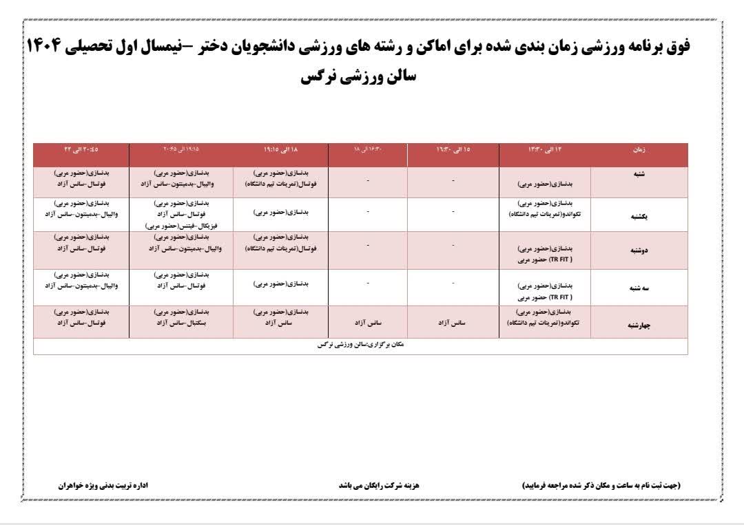 جدول فوق برنامه ورزشی خواهران (نیم سال اول 1405-1404)