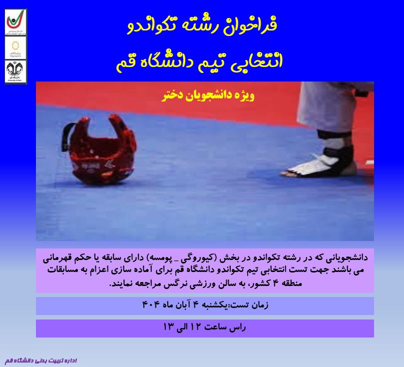 فراخوان رشته تکواندو/ انتخابی تیم دانشگاه قم گروه خبری : اداره تربیت بدنی کد خبر : 5752 کپی لینک کوتاه کلمات کلیدی رشته_تکواندوتیم_انتخابی_دانشگاهدانشجویان_دختراداره_تربیت_بدنیدانشگاه_قم